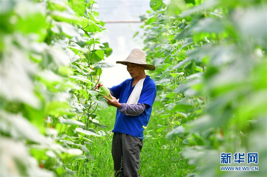 在广西融安县大良镇古兰村古兰屯大棚基地,62岁的黄显亮查看甜瓜生长情况(8月18日摄)。黄显亮是大棚基地的技术员,每个月有3000多元的工资,已于2018年实现脱贫。 新华社记者 黄孝邦 摄