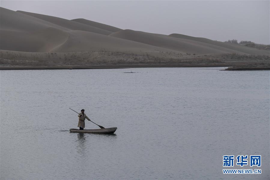在罗布人村寨,阿木东·艾不东划着卡盆准备去捕鱼(4月11日摄)。新华社记者 赵戈 摄