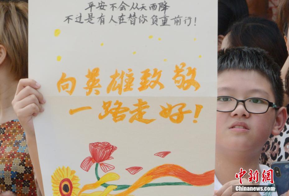 8月19日,浙江金华,一位小朋友用手绘海报为吕挺烈士送行。当日,在浙江湖州安吉县勇救落水民众时英勇牺牲的吕挺烈士骨灰从安吉回到家乡金华东阳,民众自发走上街头为英雄送行。中新社发 梁飞 摄