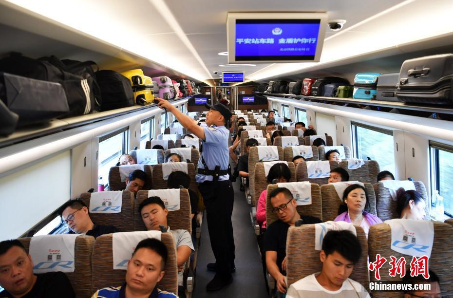 8月20日,在北京西至贵阳北的G81次列车上,北京铁路公安局石家庄公安处乘警支队老乘警郑传军正在各车厢认真巡查。这次“出征”是郑传军从事乘警工作34年来的最后一个班。他几乎值乘过石家庄乘警支队担当的所有线路。无论是春城昆明、花城广州,还是山城重庆、冰城哈尔滨,中国大江南北的铁路线上都有过他的身影,粗略算下来,郑传军这几十年走了约700万公里,相当从地球到月球打9个来回。图为郑传军检查旅客行李。翟羽佳 摄