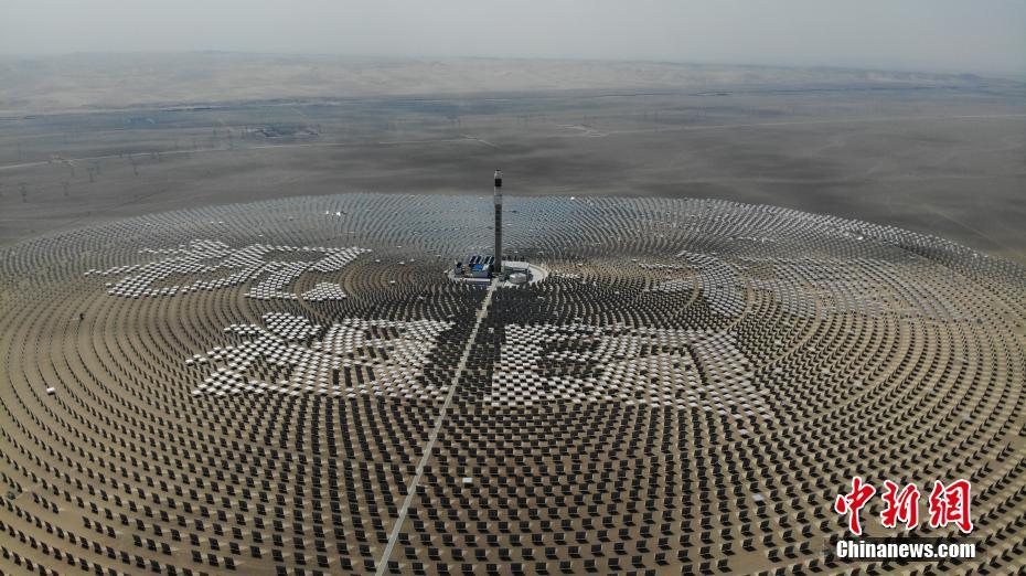 近日,在甘肃敦煌100兆瓦熔盐塔式光热发电站7.8平方公里的场区内,逾1.2万面定日镜以同心圆状围绕260米高的吸热塔,拼组成巨幅“祝福祖国”文字。该电站是中国首个百兆瓦级熔盐塔式光热电站,还是全球聚光规模最大、吸热塔最高、储热罐最大、可24小时连续发电的100兆瓦级熔盐塔式光热电站。中新社记者 杨艳敏 摄