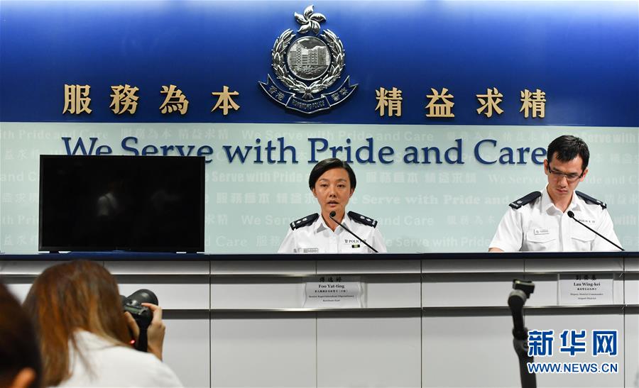 8月23日,香港特区政府警务处东九龙总区高级警司傅逸婷(左)在警方例行记者会上呼吁市民遵守机场临时禁制令,切勿以身试法。 针对有网民煽动示威者阻塞往来机场的交通,再次妨碍机场运作,香港警方23日重申,机场临时禁制令已获延长,违令者可能触犯藐视法庭罪,市民切勿以身试法。 新华社记者 刘大伟 摄