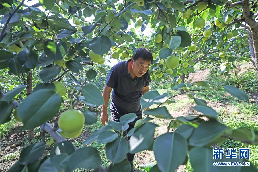 8月21日,王宏在义县张家堡镇查看早金酥梨结果情况。新华社记者 杨青 摄