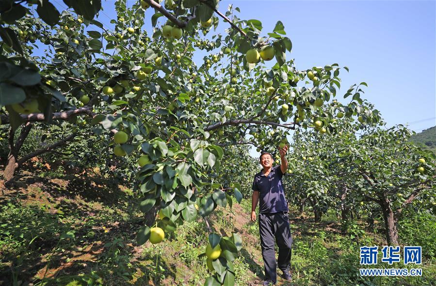 8月21日,王宏在义县张家堡镇查看早金酥梨结果情况。 新华社记者 杨青 摄