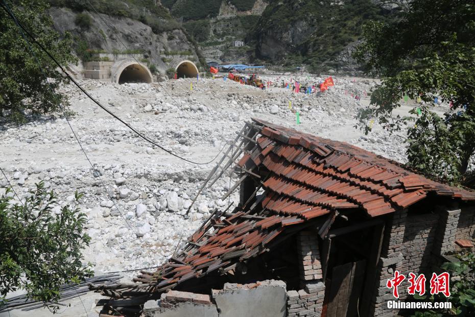 受损的房屋,远处抢险人员正在抢通受损的公路和隧道。 彭科 摄