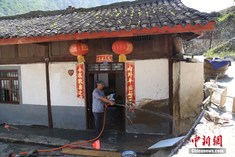 汶川暴雨灾害:森林消防帮受灾户清淤清洗尽快恢复正常生活