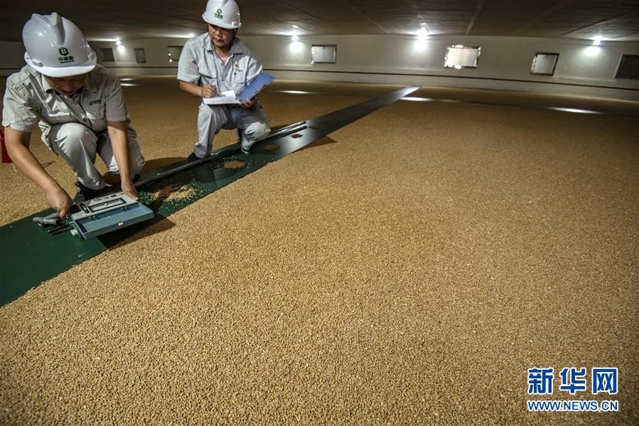 8月25日,中储粮襄阳直属库的职工在粮库内进行粮情检测。 中央储备粮襄阳直属库有限公司是中储粮集团湖北分公司设在鄂西北的中心库,中央储备粮及政策性粮储存量位居湖北分公司前列。 近年来,襄阳直属库应用了电子测温、环流熏蒸、机械通风、谷物冷却为主的“四合一”科学储粮技术,有效解决了储粮虫害和坏粮问题,确保粮食的质量与安全。 新华社记者 杜华举 摄