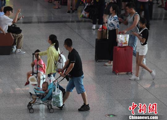 图为8月27日,家长们带着小孩前往厦门火车站候车大厅候车。 张斌 摄