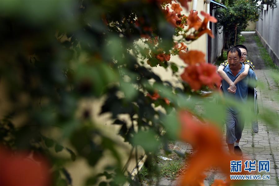 8月1日,张玉坤背着儿子张连川走在青州市云门山街道南崖头村。新华社记者 郭绪雷 摄