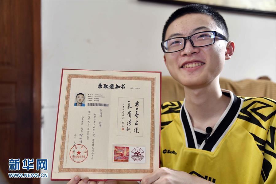 8月1日,在青州市云门山街道南崖头村,张连川展示自己的录取通知书。 新华社记者 郭绪雷 摄
