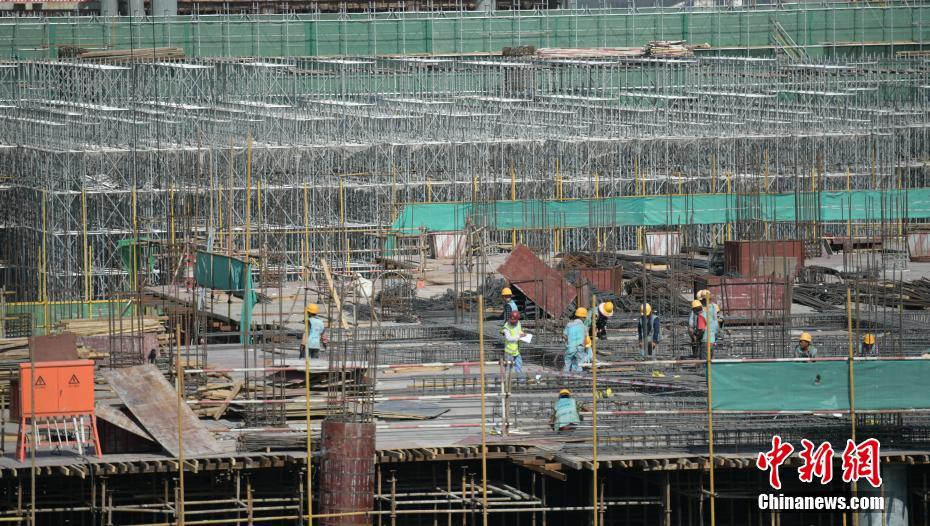 8月28日,四川简阳,天府国际机场建设工地上忙碌的工人。当日,伴随着最后一方混凝土的浇筑完成,成都天府国际机场T2航站楼主体结构提前60天全面封顶,这标志着机场航站楼主体结构全面完工。。中新社记者 刘忠俊 摄