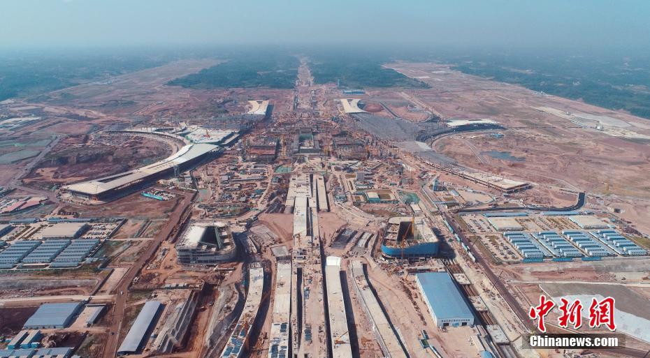 8月28日,四川简阳,空中俯瞰正在建设中的成都天府国际机场,图左为T2航站楼。当日,伴随着最后一方混凝土的浇筑完成,成都天府国际机场T2航站楼主体结构提前60天全面封顶,这标志着机场航站楼主体结构全面完工。中新社记者 刘忠俊 摄