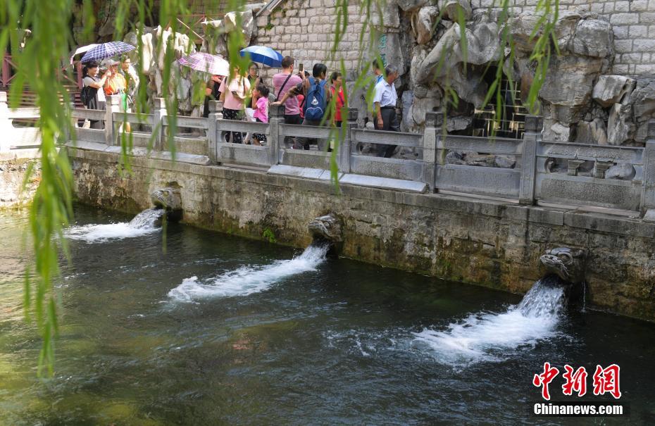 8月28日,游客观赏济南黑虎泉。近日,济南地下水位持续上升,“四大泉群”泉水喷涌强劲。中新社记者 张勇 摄