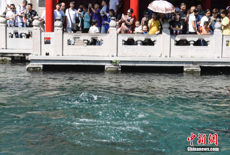 8月28日,游客观赏济南趵突泉“水涌若轮”景观。近日,济南地下水位持续上升,“四大泉群”泉水喷涌强劲。中新社记者 张勇 摄