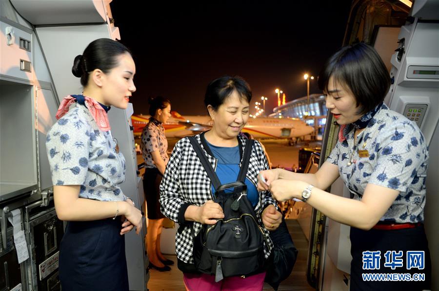 8月28日晚,在西安飞往阿联酋迪拜的东方航空MU705次航班上,空乘人员迎接旅客登机。