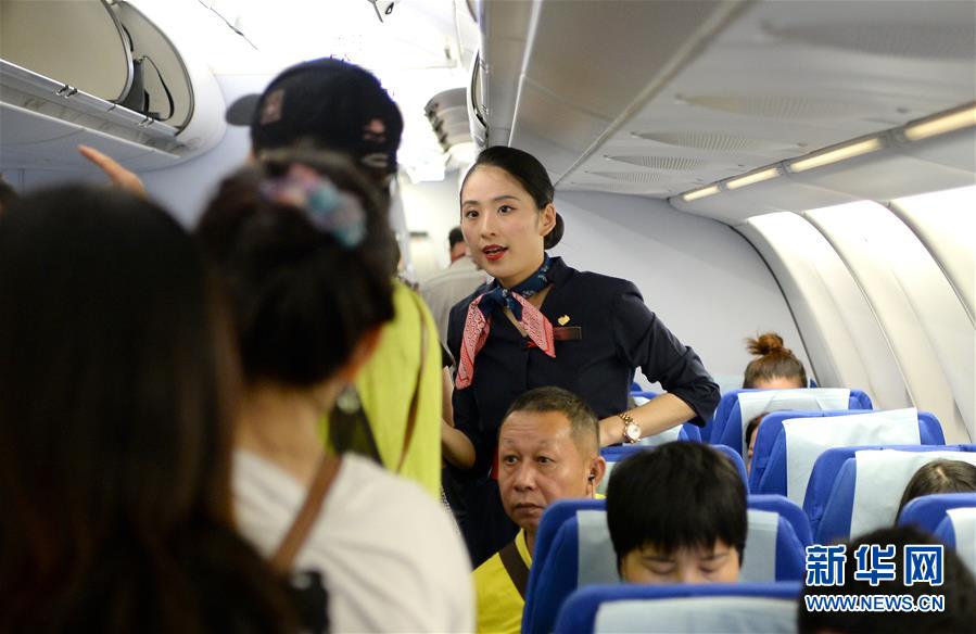 8月28日晚,在西安飞往迪拜的东方航空MU705次航班上,空乘人员引导旅客入座。新华社记者 刘潇 摄
