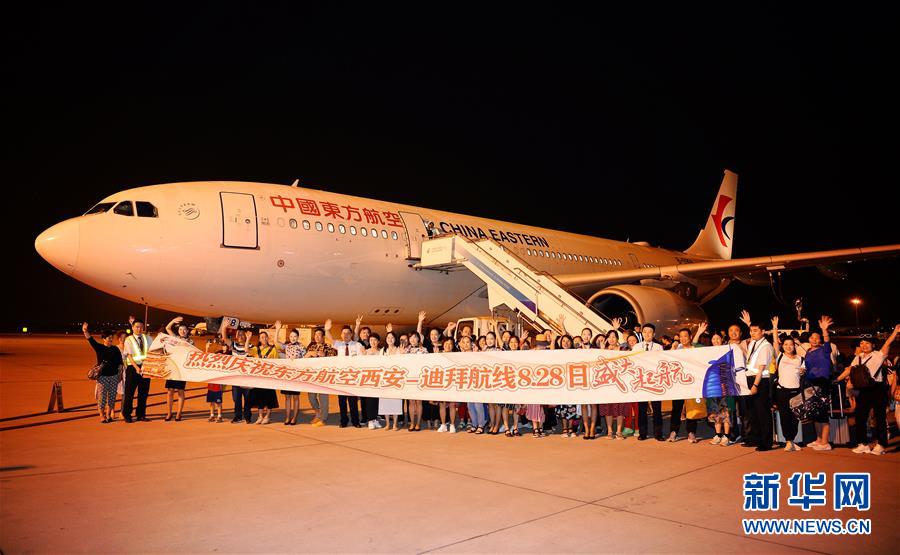 8月28日晚,从西安飞往阿联酋迪拜的东方航空MU705次航班机组人员和乘客在登机前合影留念。新华社记者 刘潇 摄