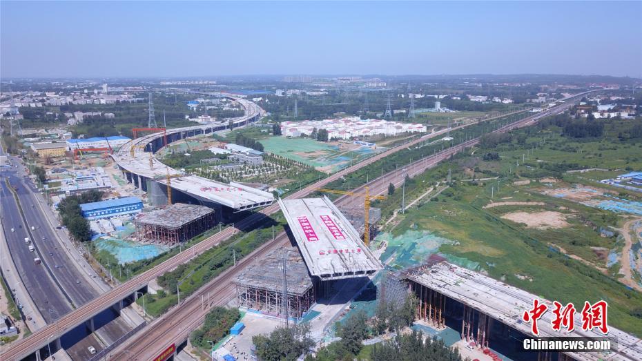 8月29日上午10时,由中铁七局郑州公司承建的郑州市四环线及大河路快速化工程大河路转体桥开始进行转体。这座总重量达6万吨的T型刚构双侧转体桥上跨郑焦城际、京广铁路、军专线等3条5股道。转体桥梁全长317米,宽38.7米,道路采用双向8车道,转体悬臂长71.75米,单侧转体桥梁重达3万吨。转体分两次完成,8月28日凌晨0时先转体铁路线一侧T构,8月29日上午转体另一侧T构,当日经过60分钟的施工,转体桥旋转62.9度,整桥合龙成功。赵亚龙 摄