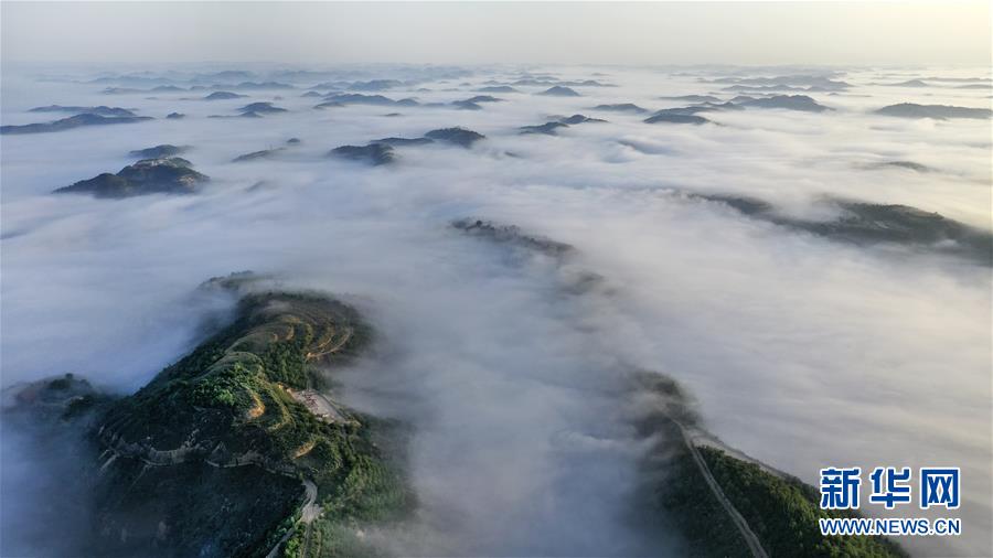 延安市吴起县吴起街道走马台村杨青流域流动的云海(6月6日无人机拍摄)。1998年,吴起县开始实施“封山退耕、植树种草、舍饲养羊、林牧主导、强农富民”的战略开发决策。1999年一次性退耕155.5万亩,走出了一条在修复生态中发展经济,在发展经济中修复生态的良性循环路子。 新华社记者陶明摄