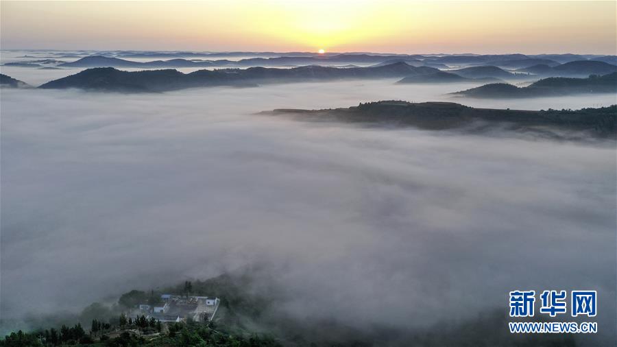 一轮红日照耀在延安市吴起县吴起街道走马台村杨青流域山峁上(6月6日无人机拍摄)。