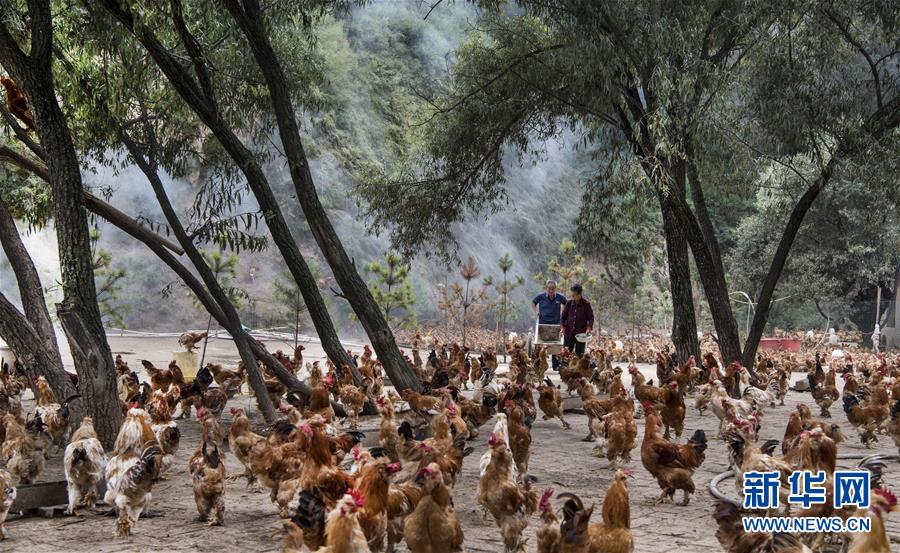 延安市安塞区雷坪塔村的张莲莲夫妇在林下喂鸡(8月27日摄)。37年来,张莲莲夫妇扎根山沟造林,栽成了20多万棵树木。如今张莲莲一家依靠繁茂的林木发展生态养鸡等产业,过着富足的生活。 新华社记者陶明摄
