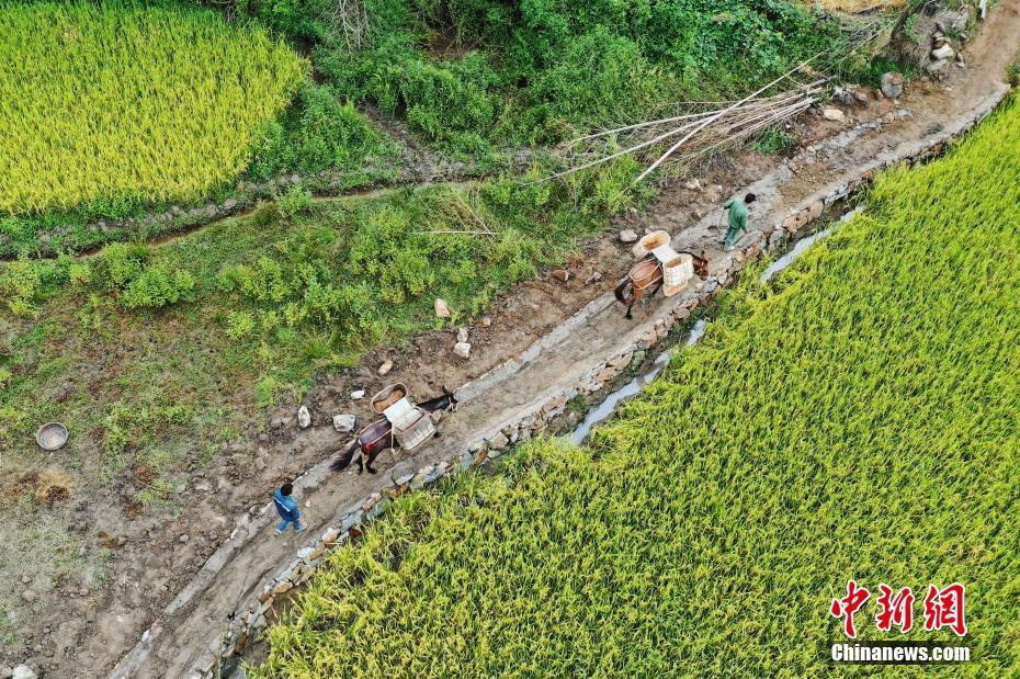 9月3日,在江西南昌市湾里区招贤镇乌井村上堡村,一支由6匹骡子组成的运输队正在山区乡村小路上前行。运输队在山区马路边为骡子装好石材后,便牵着骡子上山、下山运送建筑材料。据介绍,骡子既有驴的负重能力和抵抗能力,又有马的灵活性和奔跑能力,是崎岖山路运送材料不可或缺的运输队,目前上堡村山上修建的观光小道和民宿所需的建筑材料都是这样驮上来的。刘占昆 摄