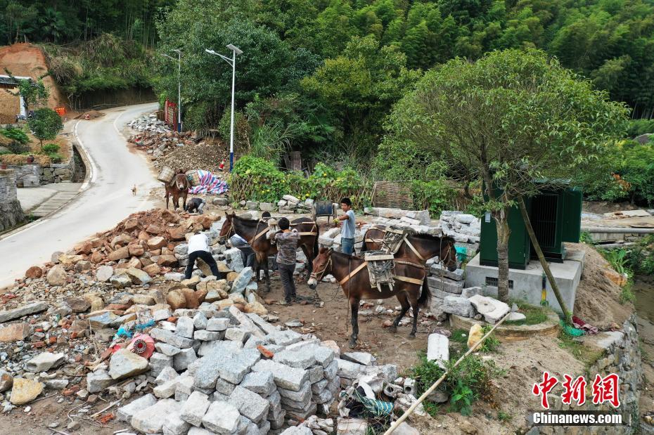 运输队在山区马路边为骡子装好石材后,他们便各自牵着骡子上山、下山运送建筑材料。刘占昆 摄
