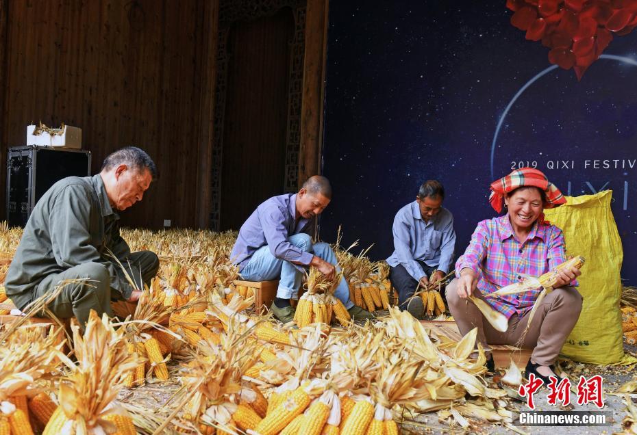 婺源篁岭村民在整理晒好的玉米,脸上露出丰收的喜悦。程希雪 摄