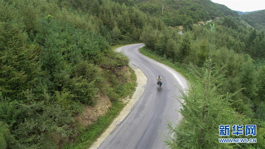 9月4日,在鸡冠山镇,耿有伟骑行在运送邮件的路上(无人机拍摄)。新华社记者 龙雷 摄