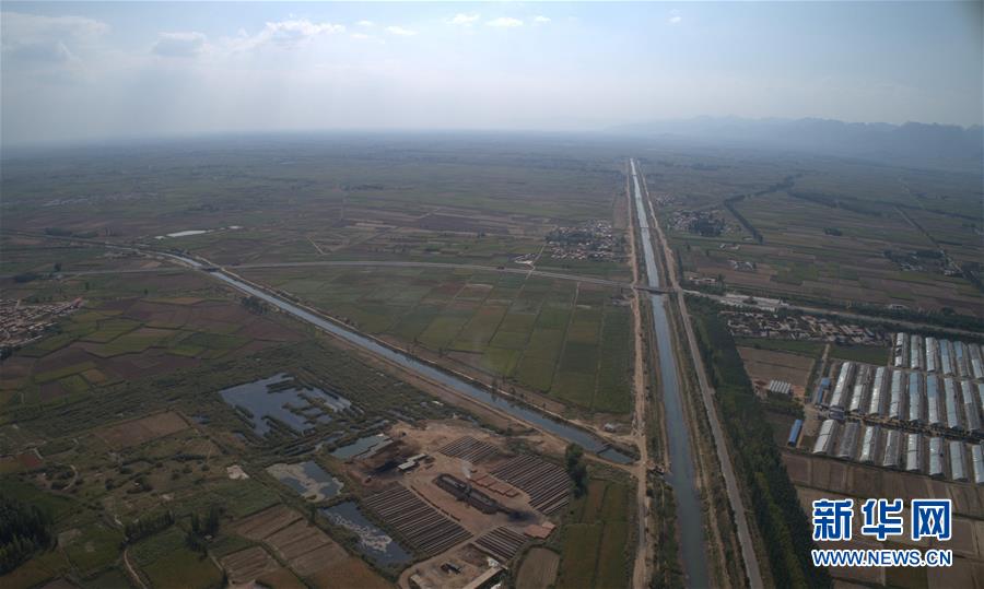 9月4日无人机拍摄的河套灌区第三排干沟(左)排水排入总排干沟(右)。 新华社记者 刘诗平 摄