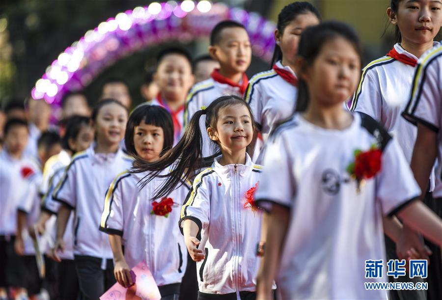 9月4日,新疆教育学院实验小学校园内,一年级新生在六年级学生的引领下走进校园。 新学年伊始,新疆教育学院实验小学举办主题为“梦想从这里启航”的开学典礼,一年级新生在六年级学生的引领下培养爱学校、爱师长、爱学习的品德,走进校园开启新生活。 新华社记者 王菲 摄