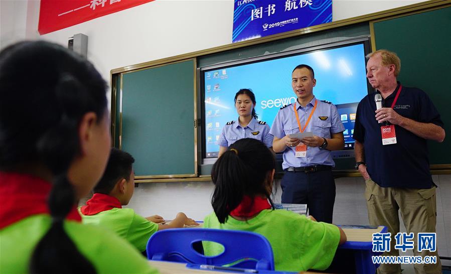 9月5日,在江西省景德镇市陶阳学校四年级的课堂上,来自中国和美国的飞行员向学生们介绍自己的飞行经历。 新学期伊始,江西省景德镇市陶阳学校开展“让梦想起航 航空知识进校园”主题活动,邀请国内外的飞行员走进校园,和学生分享飞行经历与故事,并一起动手制作航模。 新华社记者 彭昭之 摄