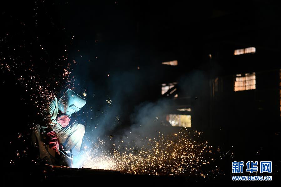 在中国一重集团有限公司的厂房内,工人在进行生产作业(8月27日摄)。 记者近日走访了位于黑龙江省齐齐哈尔市的中国一重集团有限公司和位于哈尔滨市的哈电集团旗下的几家企业,在这些企业的厂房里,每天都在上演着劳动“光影秀”,许多生产一线的工人在“光与火”中劳碌奔忙,在生产的光影中展现出劳动之美。 新华社记者王建威摄