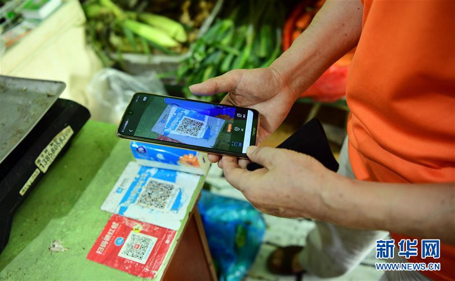 9月5日,杨福根在果蔬店用手机支付买菜的金额,家里的一日三餐都由他料理。 新华社记者翁忻旸摄