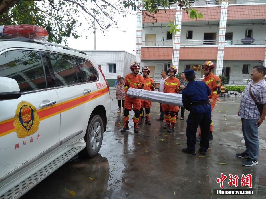 图为消防救援人员准备搭建帐篷。自贡消防 供图