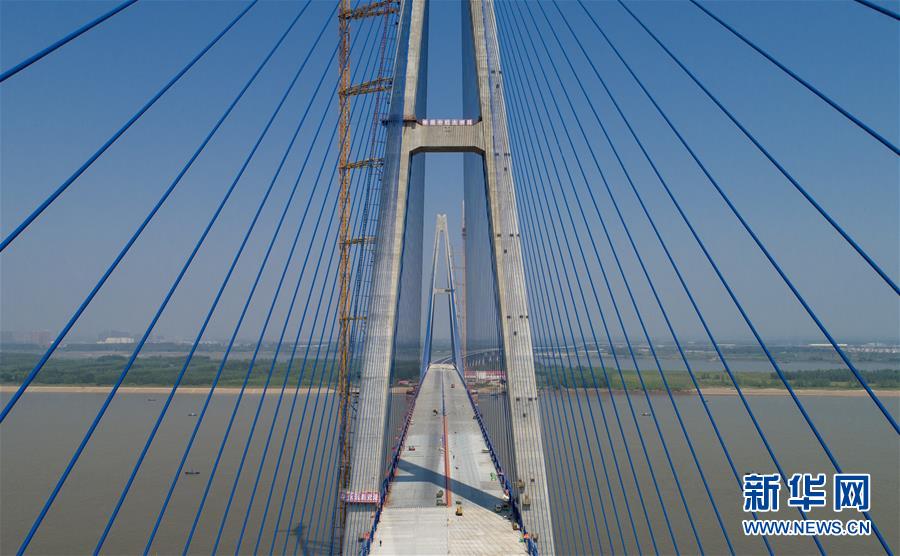 这是建设中的武汉青山长江大桥(9月9日摄)。 当日,随着桥面全面开始铺设沥青,桥宽达48米的武汉青山长江大桥主体工程基本完工,标志着这座“最宽长江大桥”进入后续沥青铺设、亮化施工阶段。 全长7548米的青山长江大桥,主跨达938米,是武汉市的第11座长江大桥。桥面比武汉沌口长江大桥还宽两米,成为目前跨越长江桥面最宽的桥梁。大桥为双向10车道高速公路,设计时速为100公里。 新华社记者 熊琦 摄
