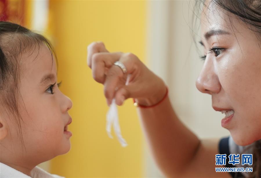 李溶溶用纸带训练听障宝宝控制气息(8月22日摄)。新华社记者 程敏 摄