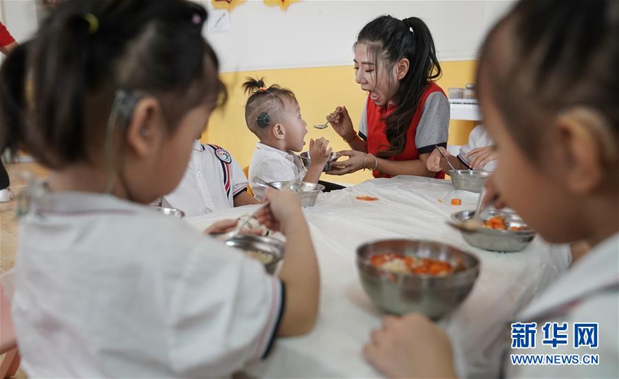 李溶溶带着听障宝宝们吃午餐(8月22日摄)。新华社记者 程敏 摄