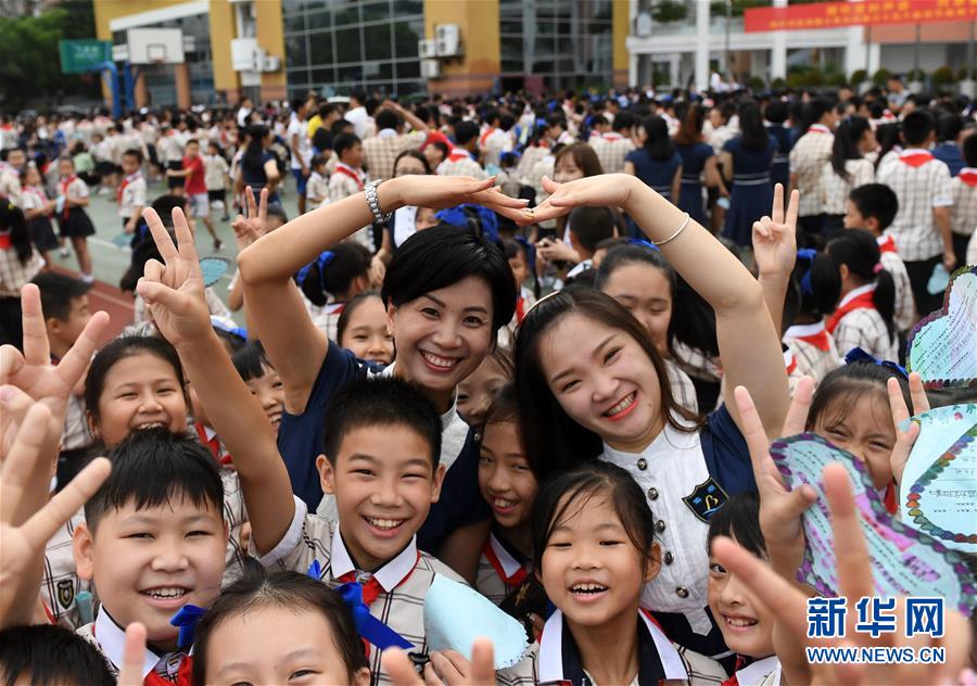 9月10日,在广西南宁市滨湖路小学,老师和学生摆造型拍照。 当日,广西南宁市滨湖路小学举办主题活动庆祝第35个教师节。 新华社记者 陆波岸 摄