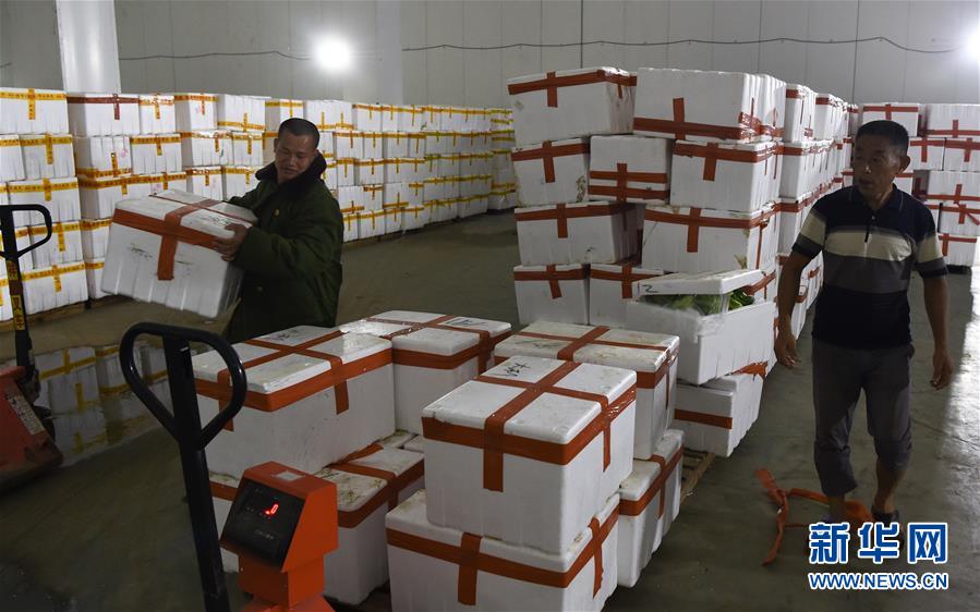 9月11日,工作人员在海口市菜篮子产业集团冷库内搬运蔬菜。新华社记者 杨冠宇 摄