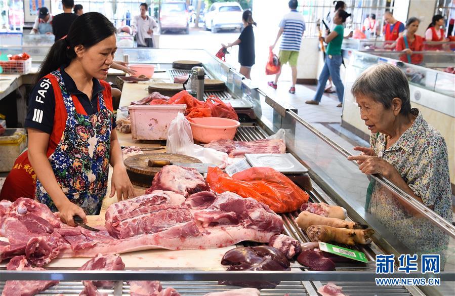 9月11日,市民在海口市金贸文华农贸市场内选购猪肉。新华社记者 杨冠宇 摄