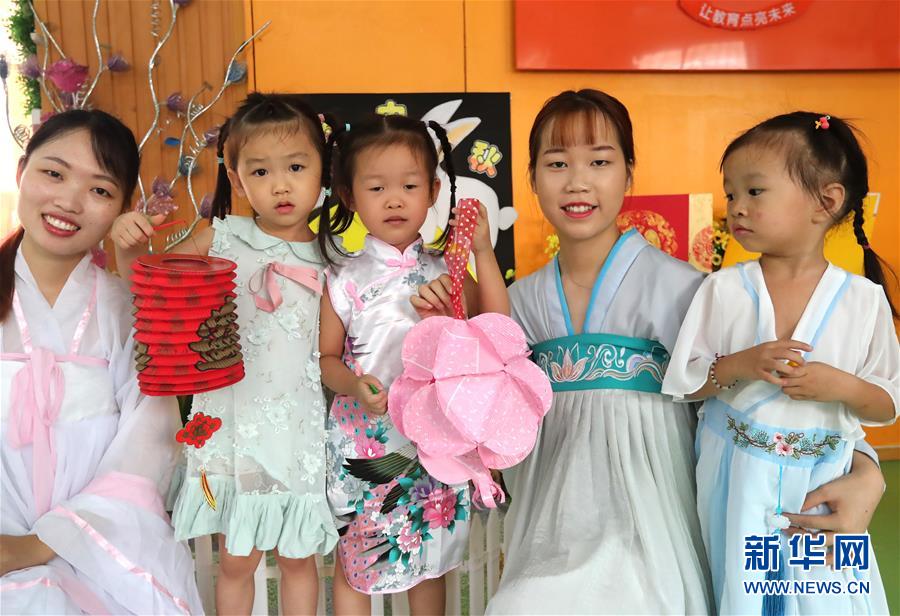 9月12日,在广西南宁市澳宝幼儿园,老师和孩子展示自制花灯。 当日,广西南宁市澳宝幼儿园的老师和孩子们一起穿汉服、展示自制传统花灯,在古风古韵中喜迎中秋节。 新华社记者 周华 摄