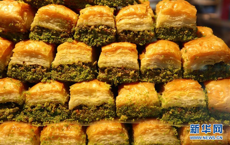 这是8月18日在土耳其伊斯坦布尔塔克西姆广场的一家甜品店拍摄的“巴克拉瓦”。果仁蜜饼“巴克拉瓦”是土耳其民众最喜爱的传统甜点之一。“巴克拉瓦”用糖浆或蜂蜜调味,中部是切碎的果仁,上下是多层用油脂起酥的酥皮,有方形、菱形和三角形,吃下去口感酥松香脆、甜蜜芬芳。 在土耳其,售卖“巴克拉瓦”的店铺遍布各个城市。无论是作为庆祝节日的盛宴上的佳肴,还是作为午后小憩的茶点,“巴克拉瓦”都深受民众欢迎。新华社记者 徐速绘 摄