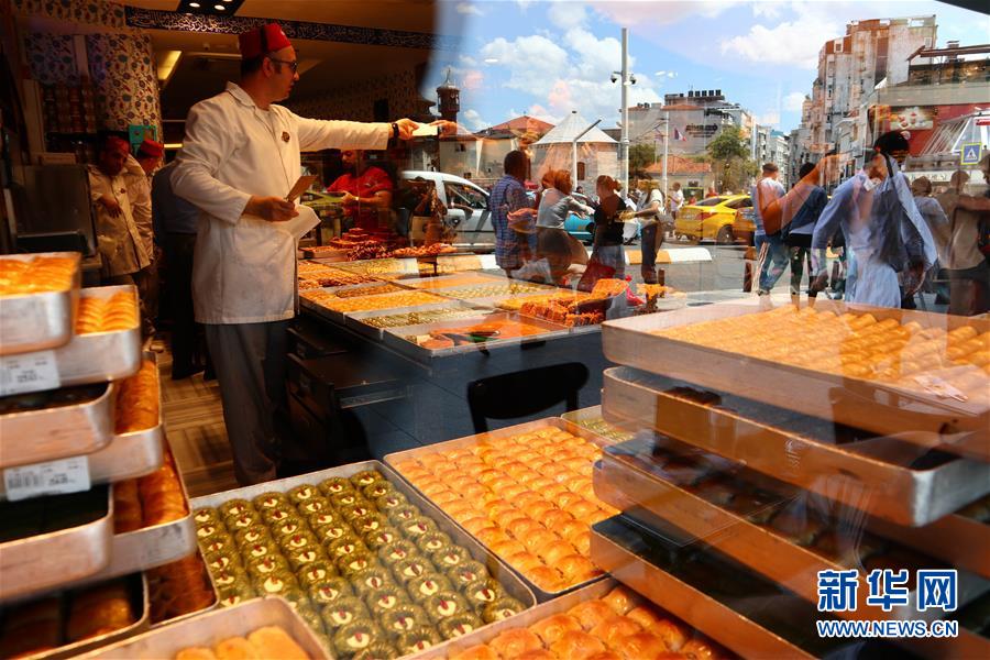 这是8月18日在土耳其伊斯坦布尔塔克西姆广场拍摄的一家销售“巴克拉瓦”的甜品店。新华社记者 徐速绘 摄