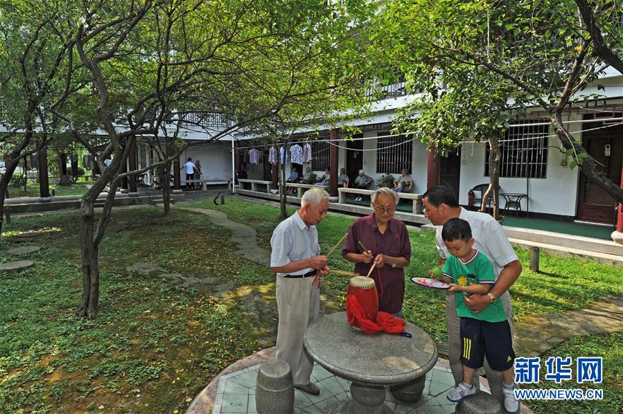 9月14日,在浙江南浔久安老年城老年公寓庭院,89岁的刘廷铉老人(左二)给从杭州前来看望他的儿子刘于大(右二)讲述敲鼓的乐趣。新华社记者 谭进 摄