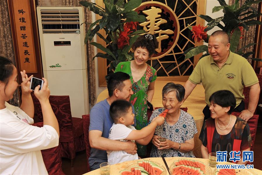 9月13日,在浙江南浔久安老年城餐厅,84岁的沈学安老人(前右二)和前来看望她的亲人欢聚。 新华社记者 谭进 摄