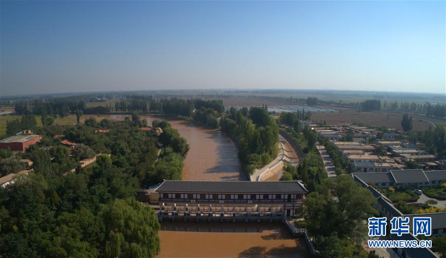 宁夏引黄古灌区唐正闸。2017年10月宁夏引黄古灌区入选世界灌溉工程遗产,这也是黄河干流上的首个世界灌溉工程遗产(9月1日无人机拍摄)。 新华社记者 刘诗平 摄