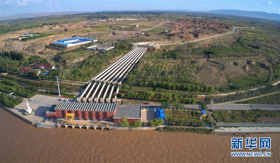 在宁夏固海扬水工程泉眼山泵站,巨大的扬水管道将黄河水从低处向高处抬升(8月31日无人机拍摄)。 新华社记者 刘诗平 摄