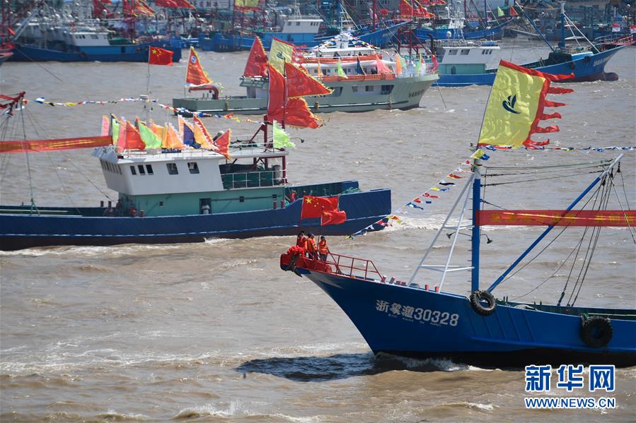 9月16日,渔船列队从全国六大中心渔港之一的浙江宁波象山石浦渔港驶出,准备入海。 当日,2019中国农民丰收节系列活动——第22届中国(宁波象山)开渔节在石浦渔港举行开船仪式。近2000艘大马力钢质渔轮在石浦渔港整装出海。 9月16日中午12时,我国东海结束为期四个半月的伏季休渔,全面开渔。 新华社记者 黄宗治 摄