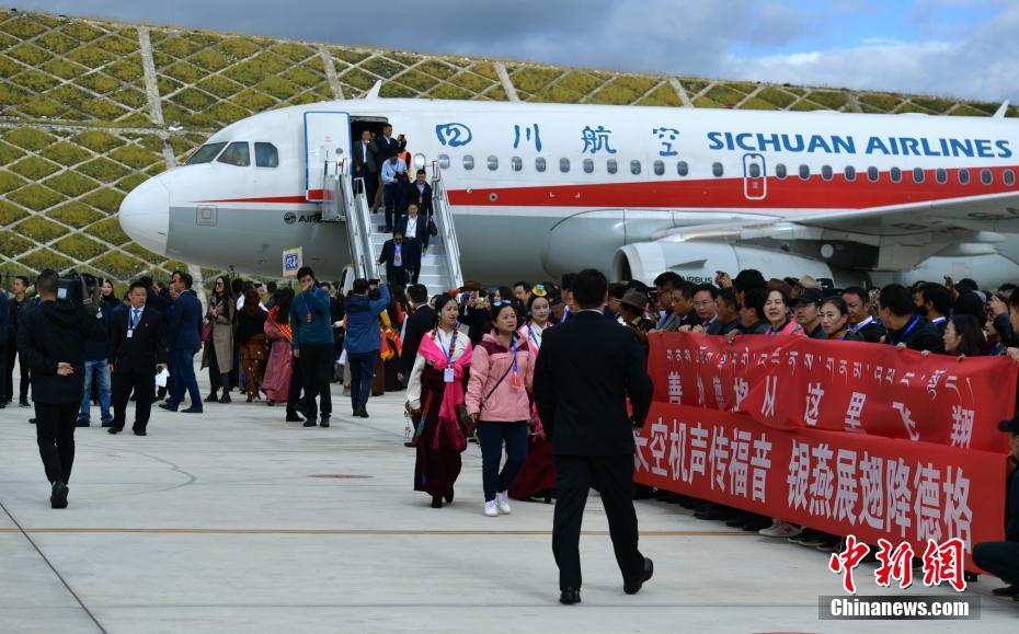 9月16日,四川甘孜县,乘坐首航航班的旅客陆续走下飞机。当日,甘孜州第三座高高原民用支线机场,海拔4068米的甘孜格萨尔机场正式通航。甘孜格萨尔机场是中国西南地区第50个民用运输机场,也是中国第5个4000米以上的民用运输机场。 中新社记者 刘忠俊 摄